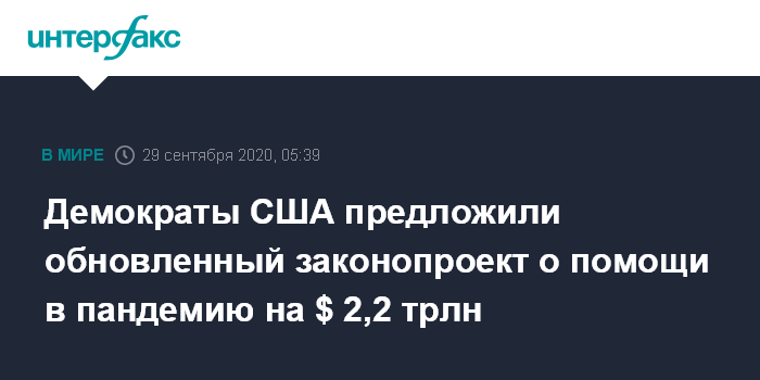Москва. 29 сентября. INTERFAX.RU - Демократы Палаты представителей США предложили обновленный вариант законопроекта о помощи гражданам в условиях пандемии COVID-19 на сумму $2,2 трлн, сообщила спикер нижней палаты Конгресса Нэнси Пелоси.