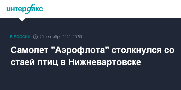 Москва. 29 сентября. INTERFAX.RU - Самолет "Аэрофлота" столкнулся со стаей птиц при заходе на посадку в аэропорту Нижневартовска, обратный рейс задержан, сообщает пресс-служба Уральской транспортной прокуратуры.