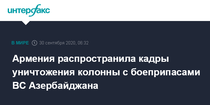 Москва. 30 сентября. INTERFAX.RU - Армия обороны непризнанной Нагорно-Карабахской республики (НКР) в течение минувшей ночи уничтожило колонну с боеприпасами ВС Азербайджана.