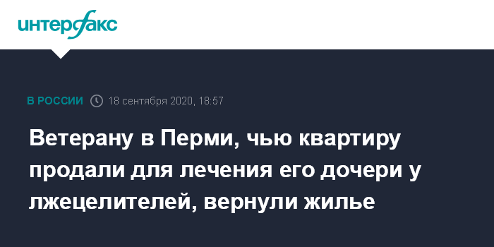 Москва. 18 сентября. INTERFAX.RU - Суд в Перми вернул квартиру 90-летнему ветерану Великой Отечественной войны, которую пришлось продать из-за нужды в деньгах для оплаты лечения дочери у экстрасенсов-мошенников, сообщили "Интерфаксу" в пресс-службе регионального управления СКР в пятницу.
