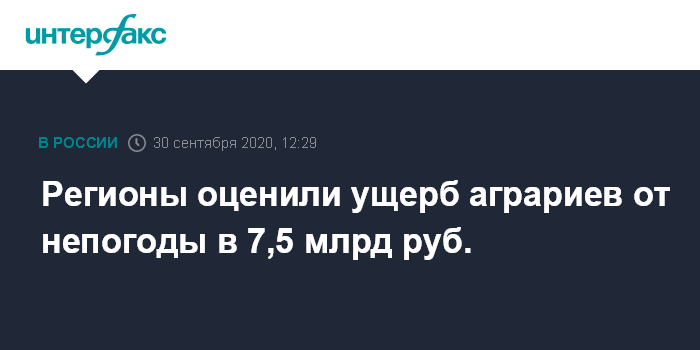 Москва. 30 сентября. INTERFAX.RU - Ущерб сельхозпроизводителей РФ в этом году от непогоды оценивается в 7,5 млрд рублей.
