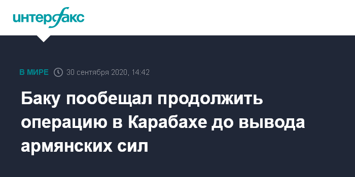 Москва. 30 сентября. INTERFAX.RU - Азербайджан призывает Минскую группу ОБСЕ осознать серьезность своих намерений в восстановлении территориальной целостности страны, военная операция в Нагорном Карабахе будет продолжаться до полного вывода армянских сил из этого региона, сообщает в среду азербайджанский МИД.