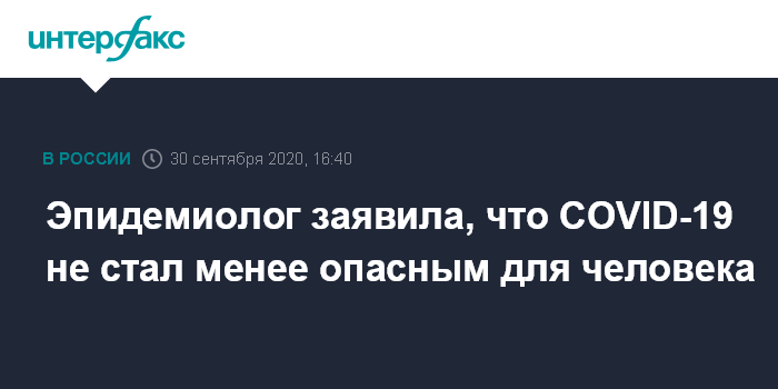 Москва. 30 сентября. INTERFAX.RU - Коронавирус не стал менее опасным для человека, несмотря на то, что о нем стало больше известно, разработаны алгоритмы его лечения, сообщила "Интерфаксу" заместитель директора по клинико-аналитической работе ЦНИИ Эпидемиологии Роспотребнадзора Наталья Пшеничная.