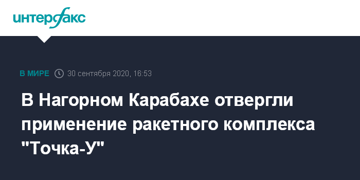 Москва. 30 сентября. INTERFAX.RU - Информационный штаб непризнанной Нагорно-Карабахской республики (НКР) опроверг сообщение Баку о применении карабахской стороной тактического ракетного комплекса "Точка-У" в боях в Нагорном Карабахе.