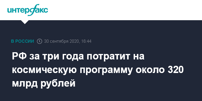 Москва. 30 сентября. INTERFAX.RU - Бюджетные ассигнования на выполнение в России Федеральной космической программы в 2021-2023 годах составят свыше 319 млрд рублей, говорится в проекте трехлетнего федерального бюджета.