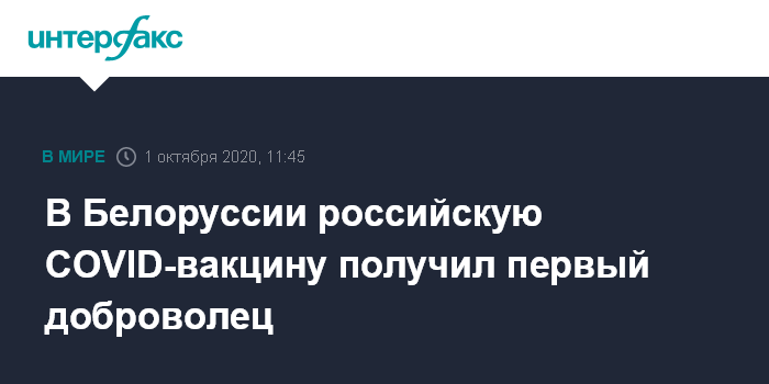 Москва. 1 октября. INTERFAX.RU - Российскую вакцину от коронавируса получил первый доброволец в Белоруссии, сообщил помощник министра здравоохранения РФ Алексей Кузнецов "Интерфаксу" в четверг.