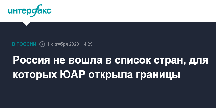 Москва. 1 октября. INTERFAX.RU - ЮАР с 1 октября открыла границы для иностранцев, однако россияне не смогут туда полететь, сообщает BusinessTech. Россия попала в перечень стран с высоким уровнем риска в связи с коронавирусом.