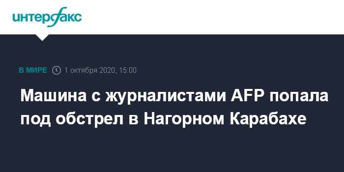 Москва. 1 октября. INTERFAX.RU - Перевозивший журналистов Agence France-Presse (AFP) автомобиль попал под обстрел c азербайджанской стороны, есть раненые, сообщает информационный штаб непризнанной Нагорно-Карабахской Республики.