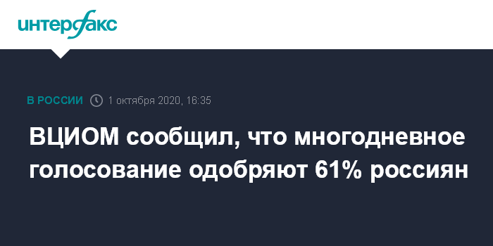 Москва. 1 октября. INTERFAX.RU - К идее проведения многодневного голосования на выборах положительно относятся 61% россиян, показал опрос ВЦИОМ. Среди тех, кто ходил голосовать 11-13 сентября, процент поддержки такого формата выше - 74%.