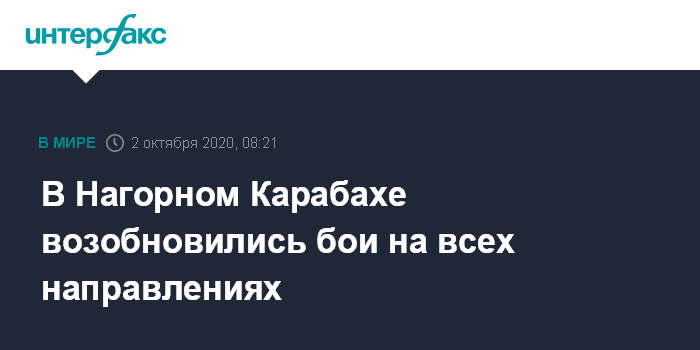 Москва. 2 октября. INTERFAX.RU - Боевые действия в зоне карабахского конфликта возобновились на всех направлениях, сообщает в пятницу пресс-служба министерства обороны непризнанной Нагорно-Карабахской республики (НКР).