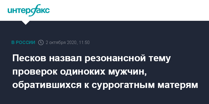 Москва. 2 октября. INTERFAX.RU - В Кремле рассчитывают, что информация о возможных задержаниях одиноких мужчин, которые решили воспользоваться помощью суррогатных матерей для рождения ребенка, будет проверена и будут даны "какие-то разъяснения", сказал пресс-секретарь президента Дмитрий Песков.