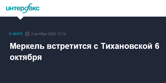Москва. 2 октября. INTERFAX.RU - Канцлер Германии Ангела Меркель во вторник встретится в Берлине с экс-кандидатом в президенты Белоруссии Светланой Тихановской, сообщила представитель правительства ФРГ Ульрике Деммер.
