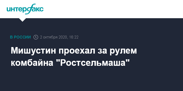 Москва. 2 октября. INTERFAX.RU - Премьер-министр России Михаил Мишустин в ходе рабочей поездки в Ростовскую область сел за руль комбайна, произведенного на заводе "Ростсельмаш", и проехал по территории предприятия.
