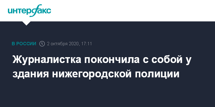 Москва. 2 октября. INTERFAX.RU - В центре Нижнего Новгорода напротив здания областного ГУ МВД женщина совершила самоубийство на лавочке. Первыми об этом сообщили очевидцы в соцсетях. Телеграм-каналы пишут, что погибла главный редактор местного интернет-издания "Koza.Press" Ирина Славина.