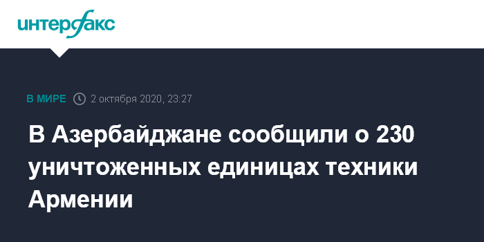 Москва. 2 октября. INTERFAX.RU - Минобороны Азербайджана сообщило о 230 уничтоженных единицах техники Армении.