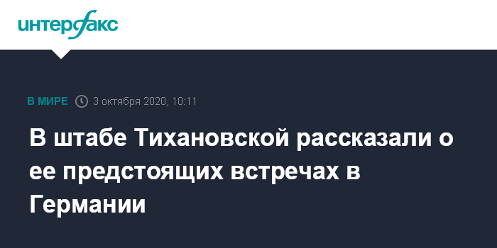 Москва. 3 октября. INTERFAX.RU - Лидер белорусской оппозиции Светлана Тихановская на следующей недели встретится с руководством Германии, сообщили "Интерфаксу" в субботу в ее штабе.