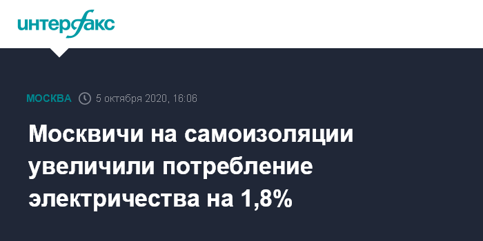Москва. 5 октября. INTERFAX.RU - В период самоизоляции и нерабочих дней в Москве бизнес снизил потребление электроэнергии на 7,2%, а в жилом секторе оно возросло на 1,8%, сообщил глава департамента экономической политики и развития города Кирилл Прутов.