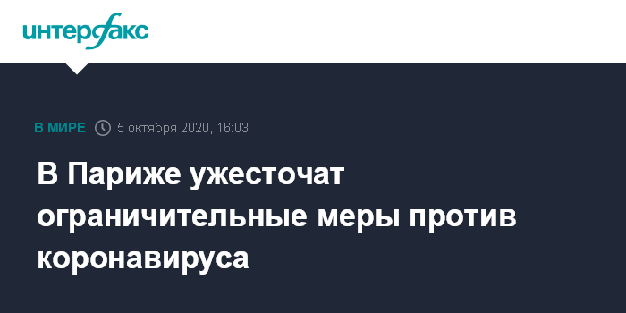 Москва. 5 октября. INTERFAX.RU - Префект полиции Парижа Дидье Лальман объявил о возвращении в связи с обострением пандемии COVID-19 к ряду строгих ограничительных мер, которые уже применялись во французской столице.