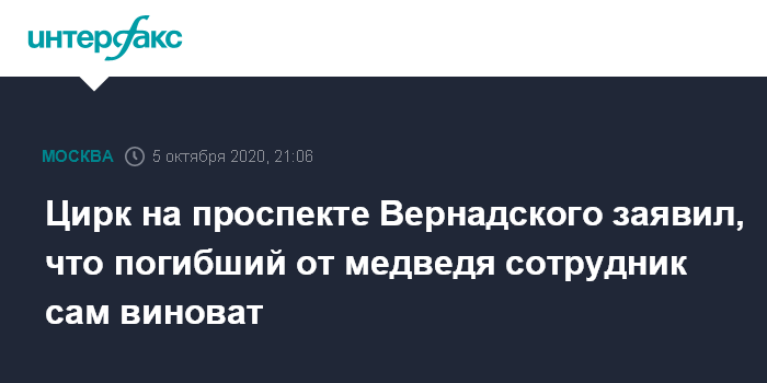 "Большой Московский государственный цирк на проспекте Вернадского с горечью сообщает, что 5 октября погиб сотрудник, который принял самовольное решение войти в вольер к взрослому 7-летнему медведю. Данный сотрудник не имел никакого права входить в вольер. Войдя, он тем самым, грубо нарушил технику безопасности. Это подтверждают видеозапись с камер наблюдений и слова очевидцев", - говорится в сообщении, размещенном вечером в понедельник на сайте цирка.