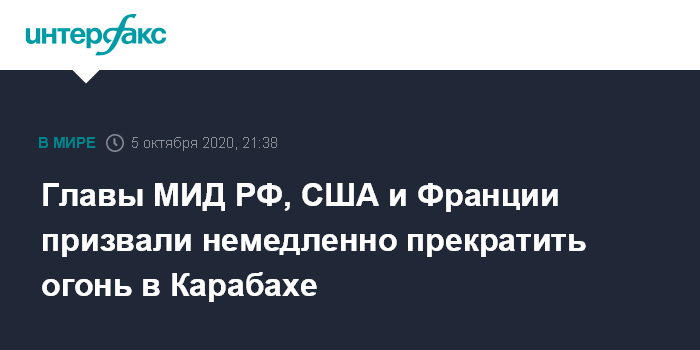 Москва. 5 октября. INTERFAX.RU - Главы МИД России, США и Франции выступили с совместным заявлением, в котором содержится призыв к немедленному прекращению огня в Нагорном Карабахе.