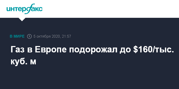 Москва. 5 октября. INTERFAX.RU - Спотовые цены на газ в Европе встретили новую неделю ростом до $160 за тысячу кубометров (контракт с поставкой "на следующий день" на голландском хабе TTF).
