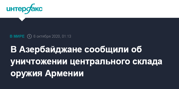 Москва. 6 октября. INTERFAX.RU - Министерство обороны Азербайджана сообщило об уничтожении центрального склада оружия и боеприпасов армянских ВС в селе Баллыджа.