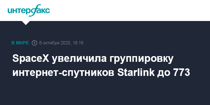 Москва. 6 октября. INTERFAX.RU - Тяжелая ракета-носитель Falcon 9 во вторник успешно вывела на низкую околоземную орбиту новую партию из 60 мини-спутников, предназначенных для продолжения развертывания глобальной сети интернет-покрытия системы Starlink.