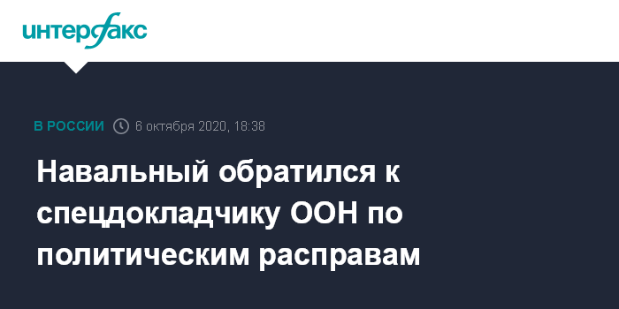 Москва. 6 октября. INTERFAX.RU - Политик Алексей Навальный сообщил, что его юристы обратятся за помощью к спецдокладчику ООН по внесудебным расправам Аньес Калламар и спецдокладчику по свободе слова Ирен Хан, чтобы они расследовали его отравление.