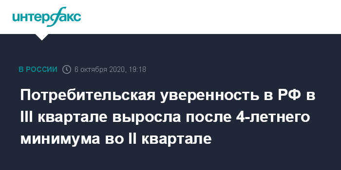 Москва. 6 октября. INTERFAX.RU - Уровень потребительской уверенности населения РФ в третьем квартале 2020 года показал восстановление после падения до четырехлетнего минимума в предыдущем "карантинном" квартале, однако к докризисным значениям он пока не приблизился.