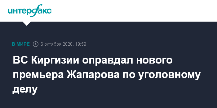 Москва. 6 октября. INTERFAX.RU - Назначенный во вторник премьер-министр Киргизии Садыр Жапаров оправдан Верховным судом республики по делу о захвате заложника в 2013 году, сообщают киргизские СМИ со ссылкой на его адвоката Шарабедина Токтосунова.