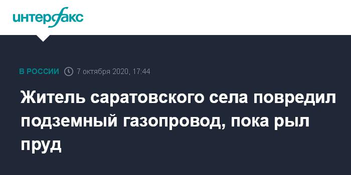 Москва. 7 октября. INTERFAX.RU - Житель села Терновка Энгельсского района Саратовской области повредил подземный полиэтиленовый газопровод высокого давления, сообщается на сайте районной администрации.