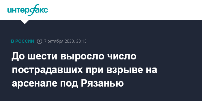 Москва. 7 октября. INTERFAX.RU - Число пострадавших во время пожара на складе боеприпасов в Скопинском районе Рязанской области возросло до шести человек, сообщили "Интерфаксу" в правительстве области.