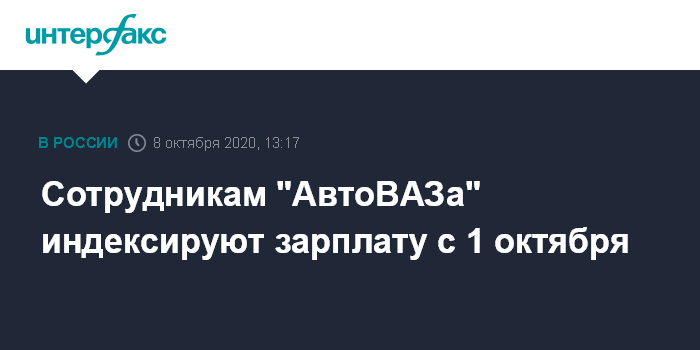 Москва. 8 октября. INTERFAX.RU - Сотрудникам АО "АвтоВАЗ" проиндексируют зарплаты на 3,5% с 1 октября, сообщается в официальной группе предприятия в соцсетях. Такой приказ подписал президент компании Ив Каракатзанис.