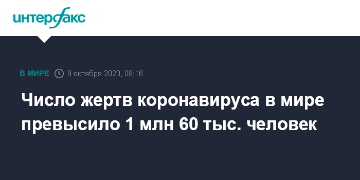 По его данным, во всем мире число жертв связанных с вирусом заболеваний выросло до 1 060 913 против 1 054 712 на утро четверга, 8 октября, излечились более 25,3 млн.