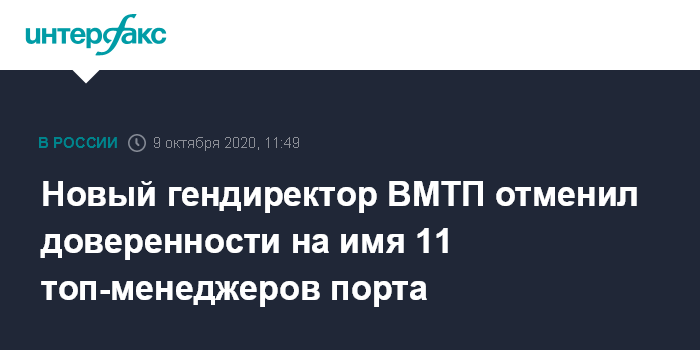 Москва. 9 октября. INTERFAX.RU - Новый гендиректор ПАО "Владивостокский морской торговый порт" (ВМТП, крупнейшая стивидорная компания в порту Владивосток, входит в группу FESCO) Роман Кухарук отозвал все доверенности, выданные ранее 2 октября 11 топ-менеджерам порта, сообщила пресс-служба FESCO.
