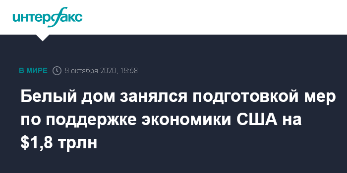 Москва. 9 октября. INTERFAX.RU - Белый дом готовит новый пакет мер по стимулированию роста экономики США, пострадавшей от пандемии коронавируса, на сумму $1,8 трлн, сообщает The Wall Street Journal со ссылкой на источники.