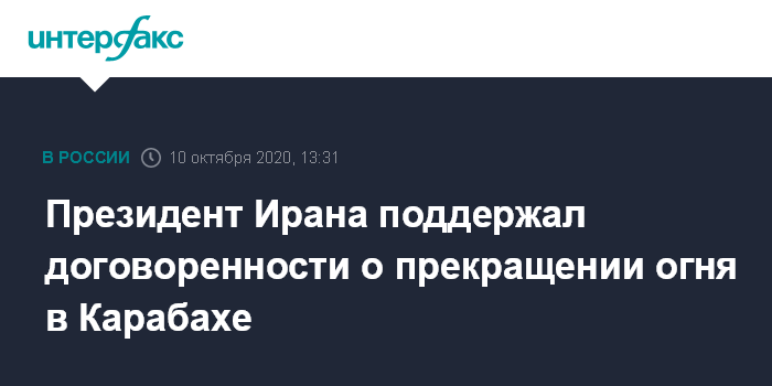 Президент Ирана выразил поддержку договоренностям о прекращении огня в гуманитарных целях, достигнутым по итогам трехсторонних консультаций министров иностранных дел России, Азербайджана и Армении.