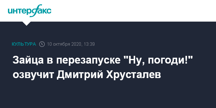 Москва. 10 октября. INTERFAX.RU - Персонажа зайца в перезапуске "Ну, погоди!" озвучит телеведущий Дмитрий Хрусталев, сообщили "Интерфаксу" в пресс-службе студии.