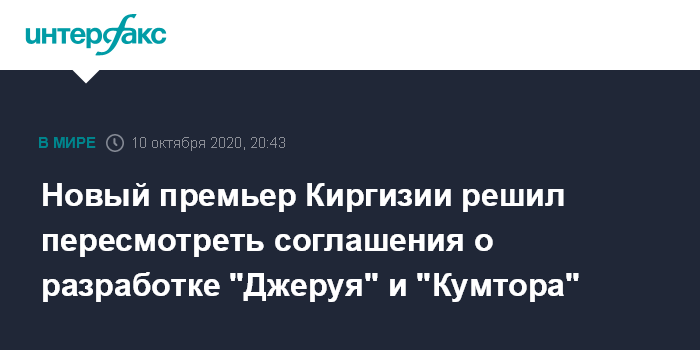 Вместе с тем в числе приоритетов утвержденного парламентом главы правительства - "пересмотр соглашений по разработке месторождений "Джеруй" (золоторудное месторождение в Таласе, разрабатывается киргизско-российским ОсОО "Альянс Алтын" - ИФ), "Кумтор" (разрабатывается канадской компанией "Центера"- ИФ) и других в целях пополнения бюджета", говорится в сообщении.