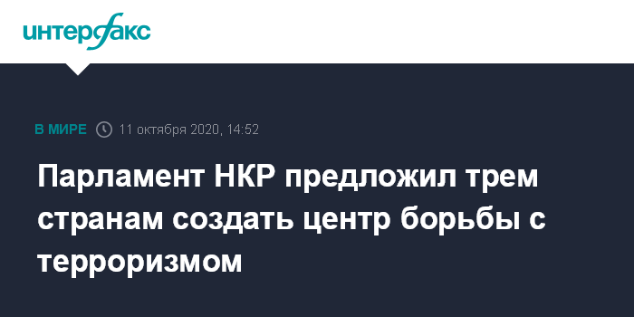 Москва. 11 октября. INTERFAX.RU - Парламент непризнанной Нагорно-Карабахской республики (НКР) обратился к Армении, России и Ирану с призывом создать совместный антитеррористический координационный центр по нейтрализации проникших в регион террористических групп.