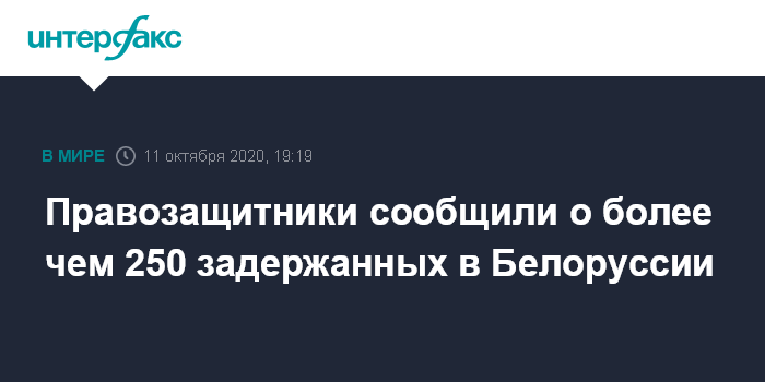 Москва. 11 октября. INTERFAX.RU - Более 250 человек задержаны на несанкционированных акциях протеста в Белоруссии воскресенье, сообщает не зарегистрированный в республике правозащитный центр "Весна".