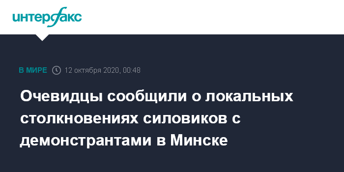 Москва. 12 октября. INTERFAX.RU - В некоторых районах Минска поздно вечером в воскресенье продолжились локальные несанкционированные акции: протестующие перекрывали дороги, пытались строить баррикады, происходили столкновения с силовиками.