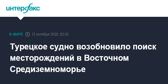 Москва. 12 октября. INTERFAX.RU - Турецкое исследовательское судно "Оруч Реис" вышло в море для продолжения геологоразведочной деятельности в Восточном Средиземноморье, сообщил в ночь на понедельник телеканал TRT Haber.