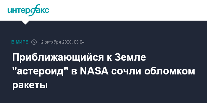 Москва. 12 октября. INTERFAX.RU - Космический объект, ранее считавшийся астероидом под названием 2020 SO, который должен в ноябре выйти на орбиту Земли, является всего лишь верхней ступенью американской ракеты, запущенной в 1966 году к Луне, заявил в интервью агентству The Associated Press директор Центра изучения околоземных объектов Лаборатории реактивного движения NASA Пол Чодас.
