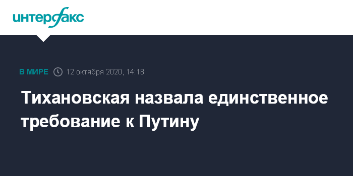 Москва. 12 октября. INTERFAX.RU - Экс-кандидат в президенты Белоруссии Светлана Тихановская по-прежнему говорит, что хотела бы встретиться с президентом России Владимиром Путиным. В интервью TUT.BY она сказала, что у нее единственное предложение к российскому лидеру - не вмешиваться и дать белорусам "все сделать самим".