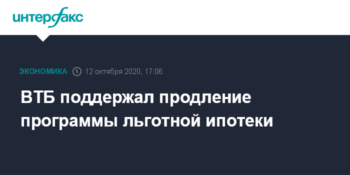 Москва. 12 октября. INTERFAX.RU - ВТБ поддерживает предложение Минфина продлить до конца 2021 года программу льготной ипотеки с субсидируемой ставкой для заемщика 6,5%. Об этом через пресс-службу сообщил заместитель президента-председателя правления банка Анатолий Печатников.