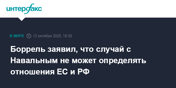 Москва. 12 октября. INTERFAX.RU - Реакция ЕС на произошедшее с российскими оппозиционером Алексеем Навальным не означает, что Брюссель остановит контакты с РФ по ключевым направлениям, заявил глава европейской дипломатии Жозеп Боррель.