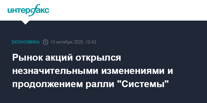 Москва. 13 октября. INTERFAX.RU - Рынок акций РФ на старте торгов во вторник демонстрирует незначительные изменения индексов и смешанную динамику blue chips на фоне разнополярных внешних сигналов; продолжают ралли акции АФК "Система", обновляющие максимум с января 2017 года.