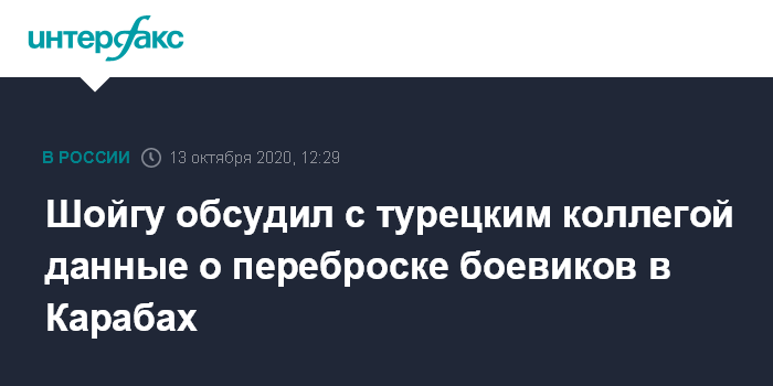 "Особую тревогу Минобороны России вызывает поступающая информация о переброске в район конфликта в Нагорном Карабахе боевиков террористических группировок с Ближнего Востока. Данная озабоченность в ходе состоявшихся вчера переговоров по телефону была доведена министром обороны РФ генералом армии Сергеем Шойгу главе военного ведомства Турецкой Республики Хулуси Акару", - говорится в сообщении.