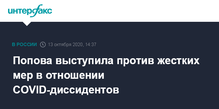 Ранее 13 октября она заявила, что считает крайне важным предотвратить COVID-диссидентство среди населения, а также диссидентство в отношении вакцины против коронавируса. "И вот эта информационная кампания для нас сейчас крайне важна: надо донести знания и донести обязательность заботиться о себе до людей, это чувство ответственности все-таки должно заработать", - сказала Попова на международной научно-практической конференции "Пандемия 2020: вызовы, решения, последствия" на площадке РАНХиГС.